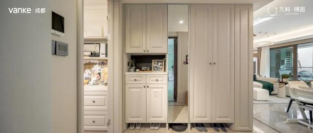 万科锦园贴心设立步入式大容量“800库”组合玄关柜。超大空间,基本满足家庭各类物品的存放。