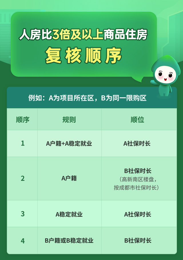 因成都高新南区无“同一住房限购区域”,为避免第二顺序出现大量具备同等条件无房居民家庭或棚改货币化安置住户的情况,对于位于成都高新南区的商品住房项目,若第一顺序加第二顺序的无房居民家庭或棚改货币化安置住户超过其房源数3倍,则第二顺序按其在成都市稳定就业且连续缴纳社保的时间长短依次复核。