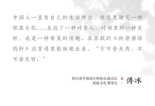 本次建发央玺“玺说东方”特邀四川省平面设计师协会副会长、黒蚁文化董事长傅冰先生参与访谈,关于新中式建筑,他表示中国人一直有自己的生活理念,住宅更讲究一种院落文化,包括人与自然、与环境的融合,是一种融洽合一的状态。