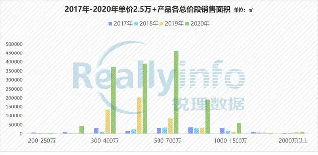 去年成都住宅市场的表现已有所印证。据统计,2019年预售单价2.5万元/㎡+住宅项目中,总价400-500万级产品出货量最高,2020年总价500-700万级产品实现超越,同比增长4倍多,成为成交中坚。