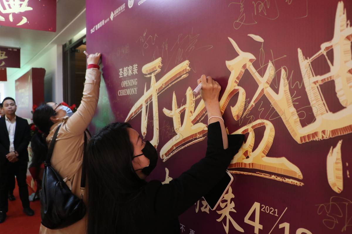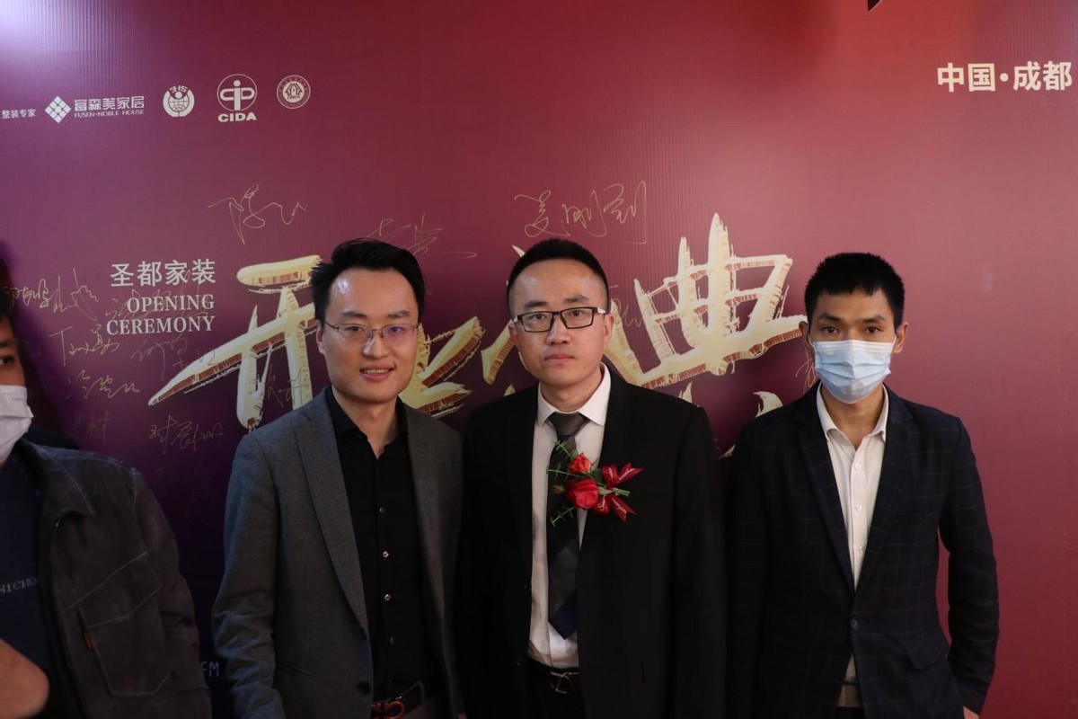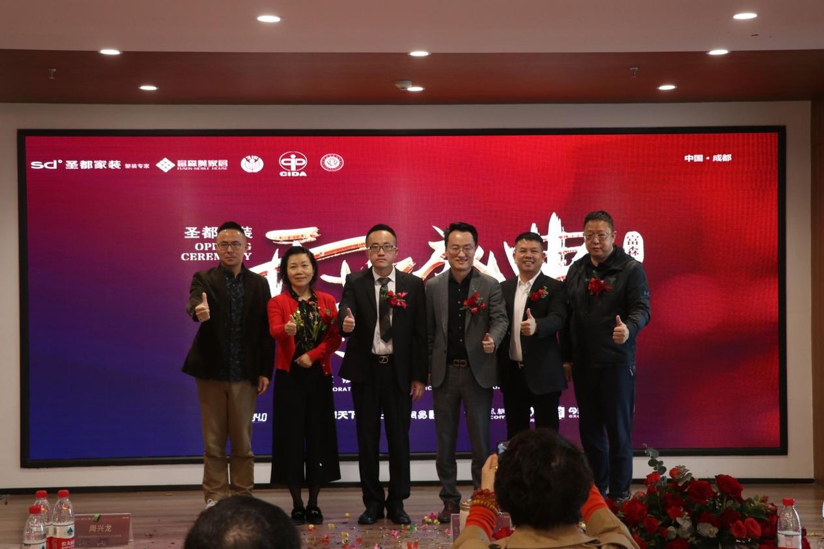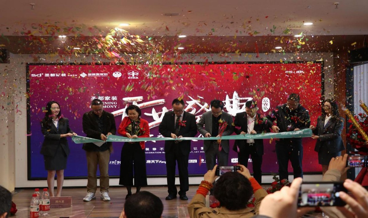 在现场来宾的共同见证下,成都市建筑装饰协会副会长兼秘书长文武,圣都家居装饰有限公司成都分公司总经理周兴龙,富森美家居股份有限公司副总经理吴宝龙,成都方尚家居有限责任公司董事长方福成,成都升达家居有限公司总裁赵斌,成都久善博达实业有限公司董事长汤亚同上台剪彩。