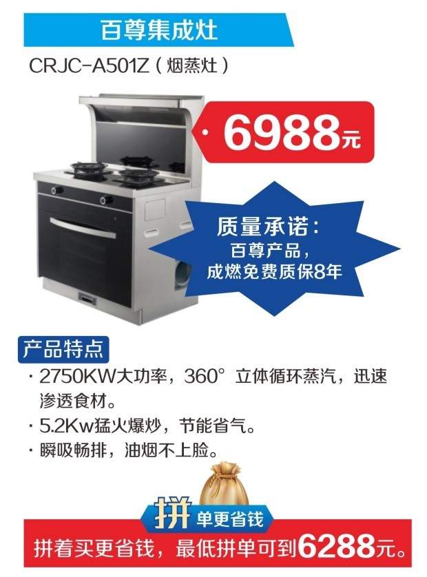 百尊集成灶CRJC-A501Z(烟蒸灶):能蒸善烟,灶就不凡。
